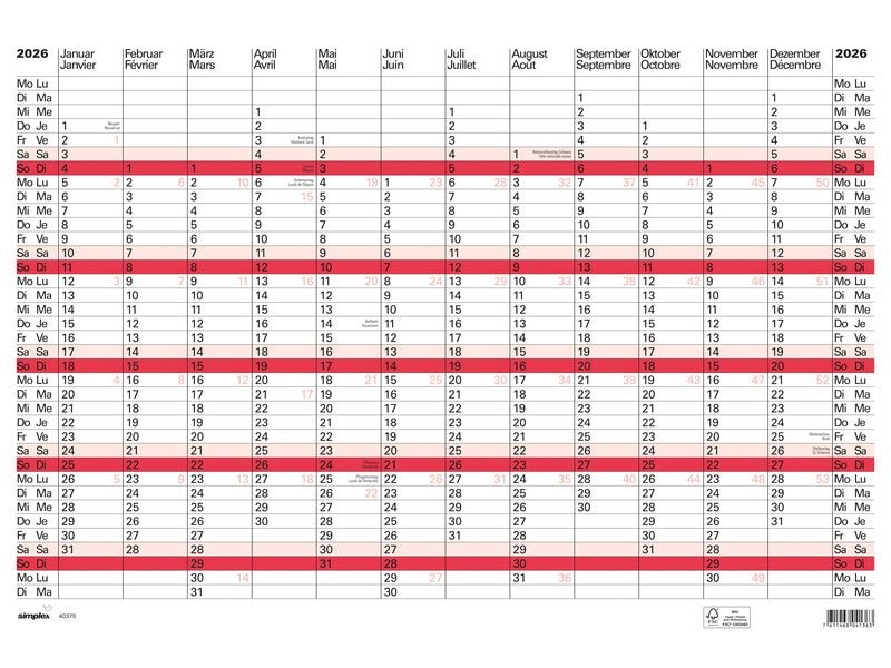 Simplex Pianificatore annuale mit Notizraum A2 59.4 x 42 cm, 2026